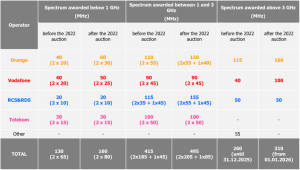 The distribution of the spectrum allocated before and after the 2022 selection procedure is presented – by operators – in the table below (the recently awarded new usage rights enter into force on 01 January 2023, excepting the 3400-3800 MHz band).