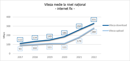 Conform rezultatelor testelor realizate de utilizatorii finali în cadrul platformei Netograf pe parcursul anului 2022, viteza medie de download la nivel național a crescut cu aproximativ 27% față de anul precedent, înregistrând o valoare de 331 Mbps, iar viteza medie de upload a ajuns la 280 Mbps pentru serviciul de acces la internet la punct fix, creșterea procentuală fiind semnificativă: 56% față de nivelul anului 2021.
