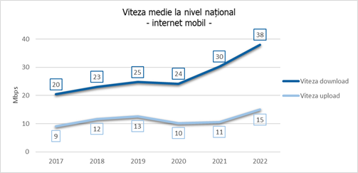 În ceea ce privește serviciul de internet mobil, viteza medie de download la nivel național a ajuns la 38 Mbps, înregistrând o creștere de circa 26%, iar viteza medie de upload a atins o valoare de 15 Mbps, fiind mai mare cu 46% față de media națională din anul precedent.