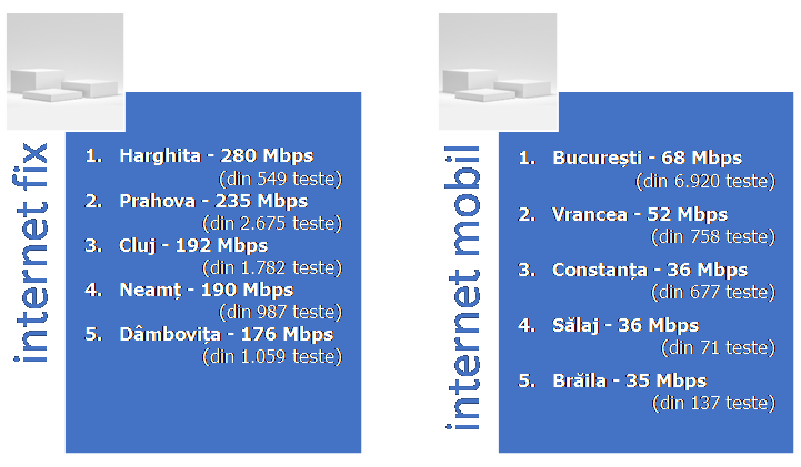 La nivel de județe, cele mai multe teste valide pentru serviciile de internet fix au fost efectuate în București (7201 teste), Prahova (2675 teste), Ilfov (2532 teste), Cluj (1782 teste) și Iași (1756 teste). Pentru serviciile de internet mobil, cele mai multe teste valide au fost localizate în București (6920), Timiș (1149), Iași (1122), Ilfov (1022) și Brașov (824).