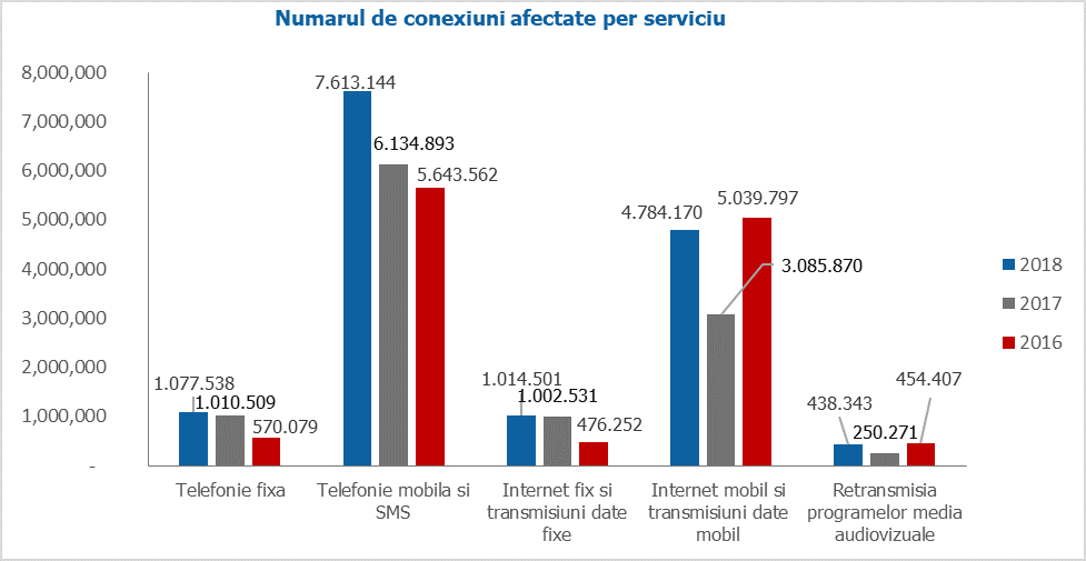 Conform cifrelor raportate de către furnizorii de servicii de telecomunicații privind incidentele care au afectat securitatea și integritatea rețelelor și serviciilor de comunicații electronice, în 2018 s-au înregistrat 556 de incidente cu impact semnificativ asupra securității și integrității rețelelor și serviciilor de comunicații electronice, în creștere cu 66% față de 2017. Acestea au afectat, în total, aproape 15 milioane de conexiuni. Cele mai multe conexiuni afectate de incidentele semnificative sunt cele de telefonie mobilă și SMS (peste 7,6 milioane de conexiuni), urmate de serviciile de internet mobil (peste 4,7 milioane de conexiuni), telefonie fixă (peste 1 milion de conexiuni) și internet fix (aproximativ 1 milion de conexiuni), cele mai puțin afectate fiind cele de retransmisie a programelor audiovizuale (aproximativ 438 de mii de conexiuni).