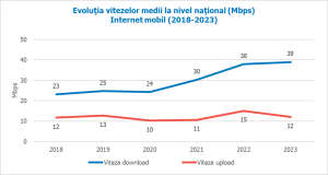 În ceea ce privește serviciul de internet mobil, viteza medie de download la nivel național a ajuns la 39 Mbps (față de 38 Mbps în 2022), iar viteza medie de upload a înregistrat o valoare de 12 Mbps, fiind în scădere față de anul 2022.