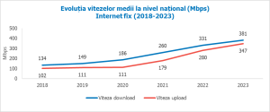 Față de valorile înregistrate la nivelul anului 2018, în 2023 viteza medie de download pentru internetul fix a crescut cu 184%, iar viteza medie de upload a crescut cu 240%.