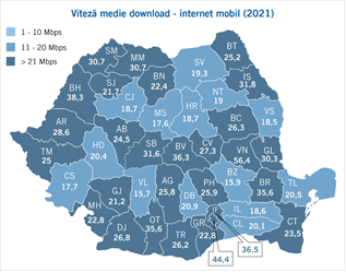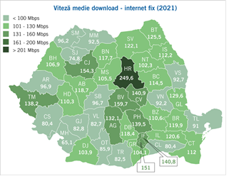 Viteza medie de download pentru conexiunile de internet fix variază de la un județ la altul, între 65,1 Mbps (Mehedinți) și 249,6 Mbps (Harghita). În ceea ce privește conexiunile de internet mobil, viteza medie de download variază între 15,7 Mbps (Vâlcea) și 56,4 Mbps (Vrancea).