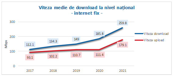 Testele efectuate de utilizatori pe platforma Netograf arată că în anul 2021 viteza medie de download la nivel național pentru internetul fix a crescut cu aproape 40% față de anul 2020, până la 259,8 Mbps, în timp ce viteza medie de upload a înregistrat o creștere aproximativă de 60%, ajungând la 179,1 Mbps.