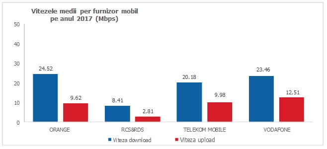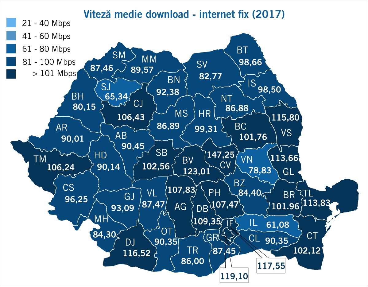Conform statisticilor privind calitatea serviciului de internet fix și mobil din România elaborate pe baza testelor realizate pe Netograf.ro aplicația ANCOM pentru testarea calității serviciului de internet în anul 2017 românii au experimentat viteze medii de download la nivel național de 112,1 Mbps pentru serviciul de acces la internet la punct fix (186,6 Mbps pentru conexiunile de tip fir și 61,26 Mbps pentru conexiunile de tip wireless) și 20,44 Mbps pentru serviciul de acces la internet la puncte mobile. Vezi aici Raportul ANCOM privind calitatea serviciului de acces la internet în anul 2017.