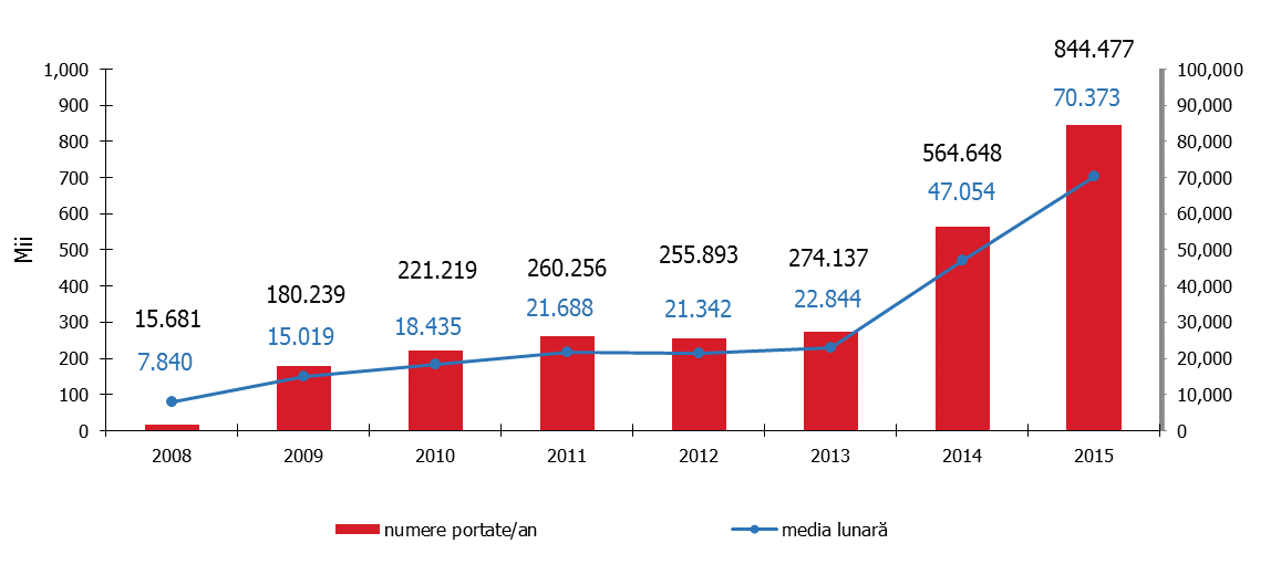 Din totalul de 2.616.550 de numere portate în România, 844.477 de numere au fost portate numai în anul 2015, volumul de numere portate crescând constant în ultimii ani, Autoritatea luând, de altfel, măsuri pentru a crește capacitatea de prelucrare a cererilor de către baza de date. De asemenea, media lunară de portări aferentă anului 2015 a cunoscut o creștere importantă, până la 70.373 de portări, față de 47.054 în 2014 și 22.844, cât s-a înregistrat în anul 2013.