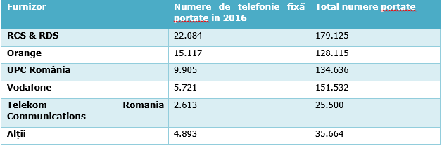 În anul 2016 au fost portate de două ori mai puține numere de telefonie fixă decât în anul 2015. Majoritatea celor 60.333de numere de telefonie fixă portate în anul 2016 au fost împărțite între principalii furnizori, astfel: RCS & RDS – 22.084, Orange – 15.117, UPC România – 9.905, Vodafone – 5.721 și Telekom Romania Communications – 2.613.