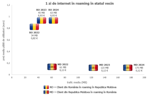 În 2024, costul mediu al unei zile de roaming bilateral a rămas același ca în 2023, în condițiile unei creșteri semnificative (+42%) a traficului zilnic de internet. Astfel, o zi de internet în roaming în statul vecin a însemnat, în medie, un trafic de 175 MB pentru utilizatorii din Republica Moldova aflați în roaming în România și 63 MB pentru utilizatorii din România aflați în roaming în Republica Moldova.