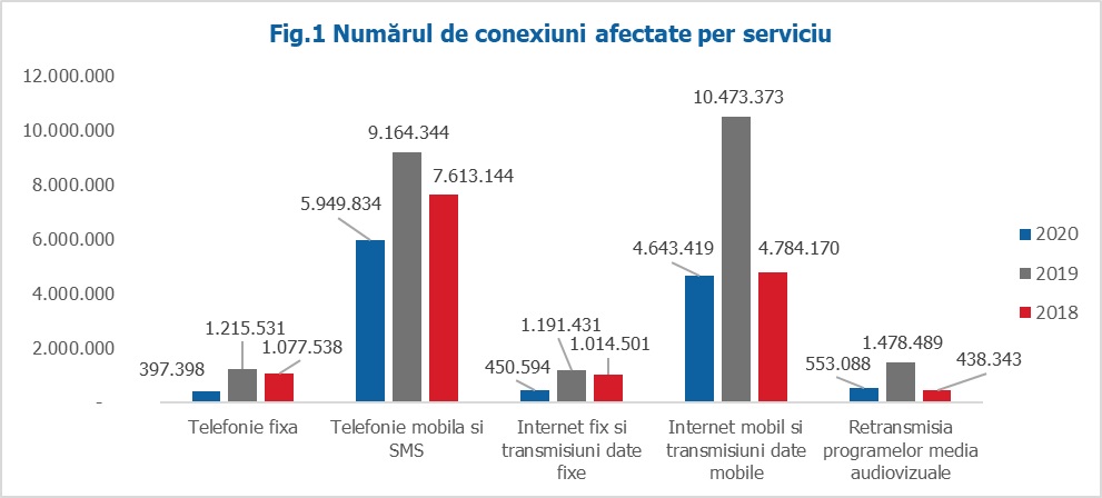 Comparativ cu ceilalți ani, în 2020 se remarca o scadere semnificativa a numarului de conexiuni afectate în cazul serviciilor de telefonie fixa si a serviciilor de telefonie mobila si SMS. De asemenea, comparând cu anul 2019, se poate observa o scadere semnificativa a numarului de conexiuni afectate în cazul tuturor serviciilor de comunicații electronice (spre exemplu: în cazul serviciului de telefonie fixa scaderea a fost cu 67%, iar în cazul serviciului de internet mobil si transmisiuni date mobile, cu 56%).