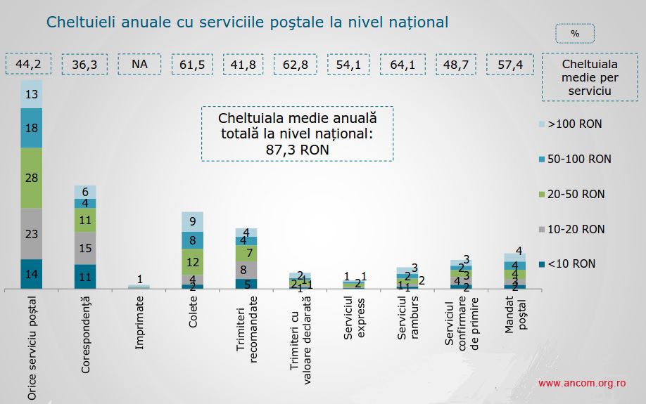 „Cele mai recente studii realizate de ANCOM în rândul utilizatorilor de servicii poștale din România arată că persoanele fizice au cheltuit anul trecut în medie 87 de lei pentru astfel de servicii, cu o medie de 106 lei pe an în mediul urban și 56 de lei pe an în mediul rural, în timp ce persoanele juridice au cheltuit, în medie, 3.400 de lei pe an pentru aceleași servicii”, a declarat astăzi Cătălin Marinescu, președintele Autorității Naționale pentru Administrare și Reglementare în Comunicații, la Courier & Postal Services Forum 2016, eveniment dedicat sectorului de servicii poștale și curierat din România.