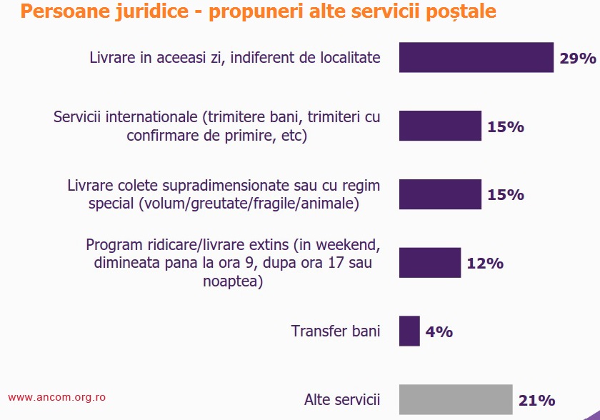 În schimb, utilizatorii persoane juridice consideră că ar fi necesar ca, pe viitor, furnizorii de servicii poștale să implementeze următoarele tipuri de servicii: livrarea trimiterilor poștale în aceeași zi, la nivel național (indiferent de localitate), servicii internaționale de livrare bani și trimiteri de corespondență internaționale cu confirmare de primire, livrare de colete supradimensionate sau cu regim special (volum/greutate/fragile/animale).